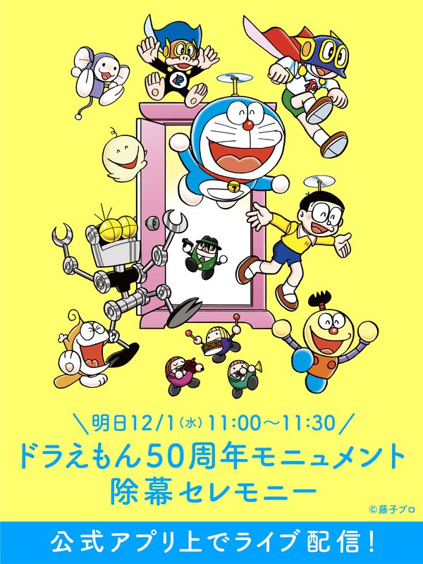 明日12月1日0:00から配信される公式アプリをダウンロードしていただき、ぜひライブ配信で、「ドラえもん50周年モニュメント」の記念すべきお披露目の瞬間を、いっしょにお祝いしましょう。なお、ライブ配信映像は同アプリ内でアーカイブ配信を予定しています。