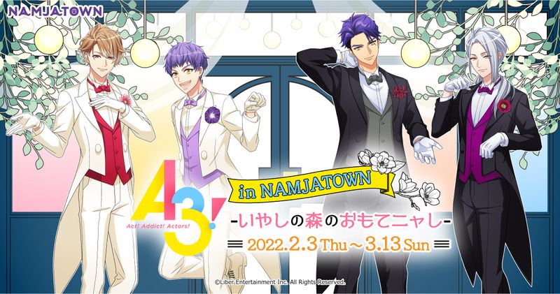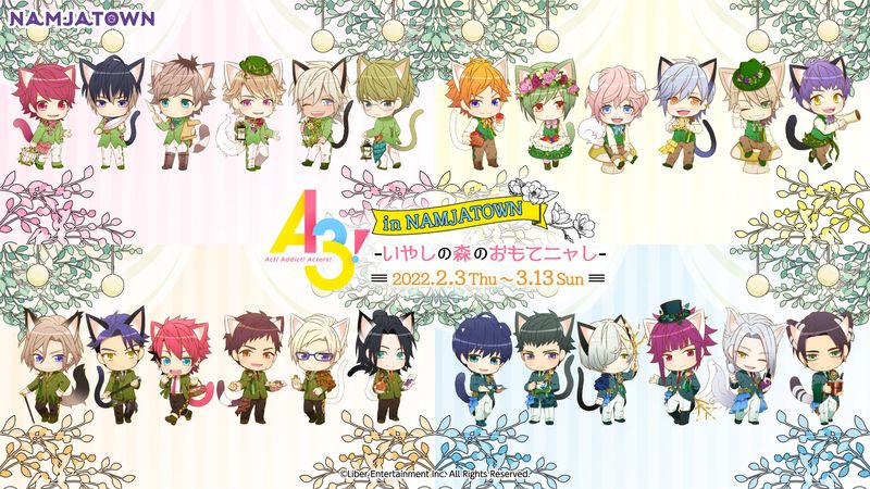 株式会社バンダイナムコアミューズメントが運営する「NAMJATOWN(ナンジャタウン)」は、1月にリリース5周年を迎えるイケメン役者育成ゲーム『A3!』とのコラボレーション催事「A3! in ナンジャタウン -いやしの森のおもてニャし-」を2022年2月3日~3月13日の期間、園内の!街区で開催します。