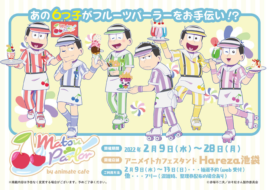 人気アニメ・ゲーム作品とのコラボレーションを展開する株式会社アニメイトカフェは、TVアニメ「おそ松さん」とのコラボレーションカフェ“「おそ松さん」×アニメイトカフェ”を、アニメイトカフェスタンドHareza池袋で開催いたします。