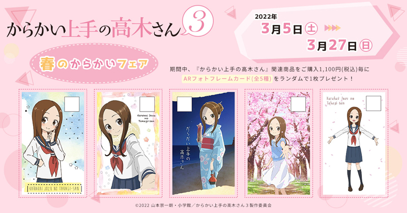 本フェア期間中は『からかい上手の高木さん』関連商品をご購入・ご予約(内金)1,100円(税込)毎に、ARフォトフレームカード(全5種)がランダムで1枚もらえます。