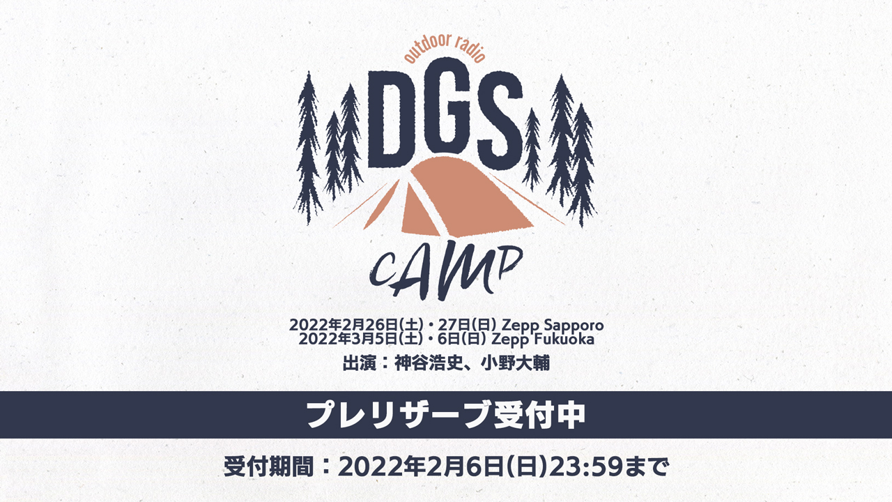 2022年2月26日・27日にZepp Sapporo、2022年3月5日・6日にZepp Fukuokaで開催される、ラジオ番組『神谷浩史・小野大輔の Dear Girl~Stories~(DGS)』のリアルイベント“DGS CAMP”について、チケットぴあでのプレリザーブが2月6日23:59まで実施中です。こちらはクレジットカード決済のみ申し込みが可能です。