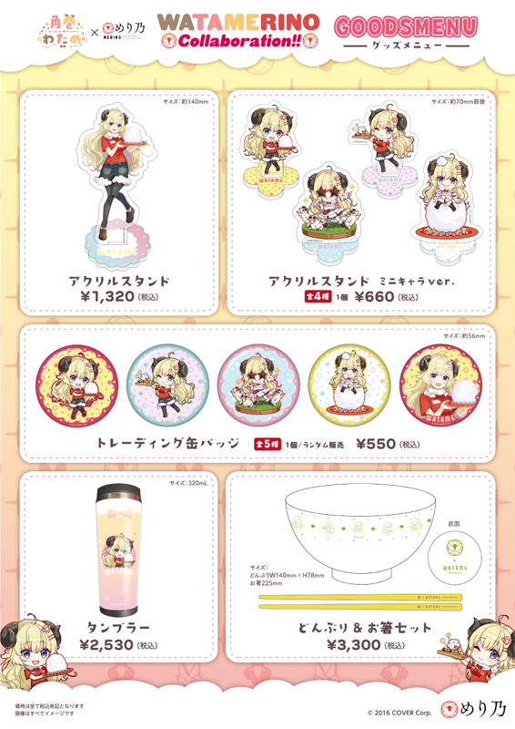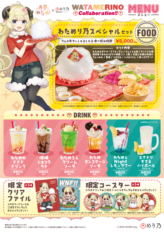 カバーが運営する女性VTuberグループ“ホロライブ”所属の“角巻わため”とTBI JAPANの運営するラム&タンしゃぶ食べ放題の飲食店チェーン“めり乃”とのコラボキャンペーン企画“WATAMERINO Collaboration”がめり乃秋葉原本店、めり乃新宿店の2店舗にて2022年3月7日より開始されます。