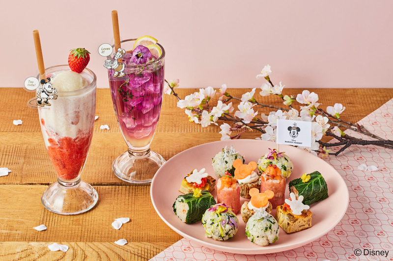 ミニーマウス&デイジーダッグをイメージした“ピンク”、“パープル”をテーマカラーに、一口サイズの手毬ごはんや巻き寿司のお食事メニューと抹茶餡や桜色のヨーグルトクリームなどを使ったオートミールパンケーキを楽しめるアフタヌーンティーセットや甘酒を使ったノンアルコールドリンクなど、日本の春を感じるスペシャルメニューをラインアップします。