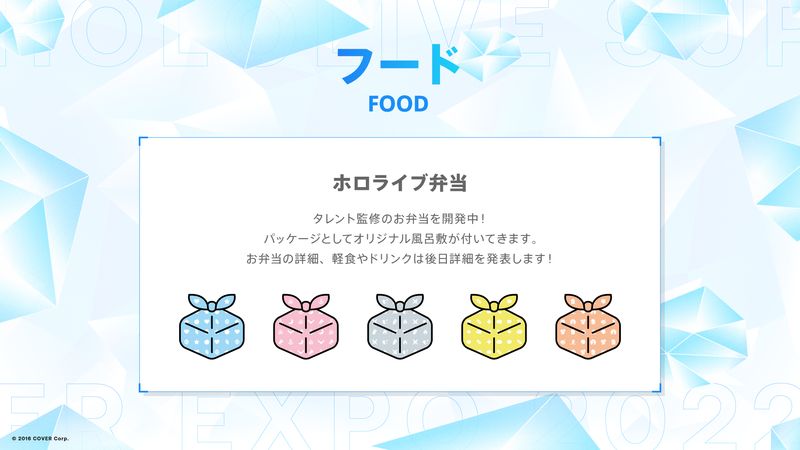 現在タレント監修のお弁当を開発中です。パッケージとしてオリジナル風呂敷が付いてきます。お弁当、軽食やドリンクは、後日詳細を発表いたします。“EXPO”チケットまたは“ALL AREA”チケットをお持ちのお客様のみ入場可能となります。