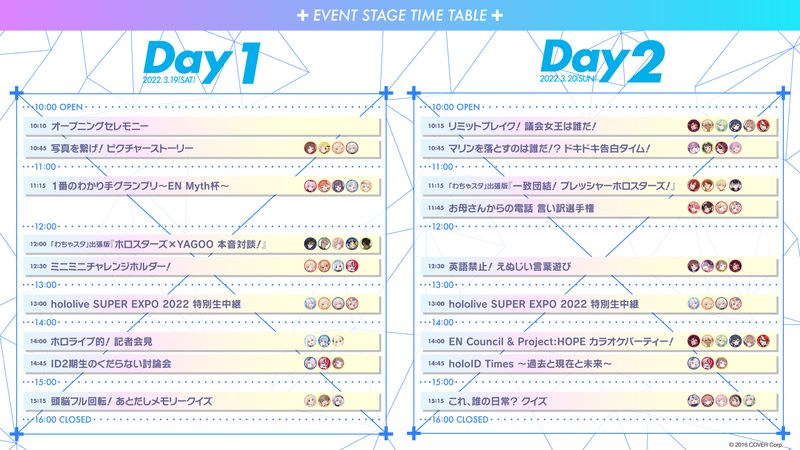DAY2:ときのそら/ロボ子さん/夜空メル/アキ・ローゼンタール/湊あくあ/紫咲シオン/百鬼あやめ/癒月ちょこ/大神ミオ/猫又おかゆ/兎田ぺこら/不知火フレア/角巻わため/ 雪花ラミィ/獅白ぼたん/アユンダ・リス/アイラニ・イオフィフティーン/森カリオペ/小鳥遊キアラ