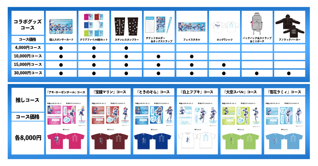 推しコースの特典グッズは一人一人のメンバーをピックアップしたデザインとなり、その名の通り”推し”をアピールできるコースです。”推し”がいる方はもちろん、“ホロライブ”を初めて知った方も本タイアップを通じて”推し”を見つけてみてはいかがでしょうか。