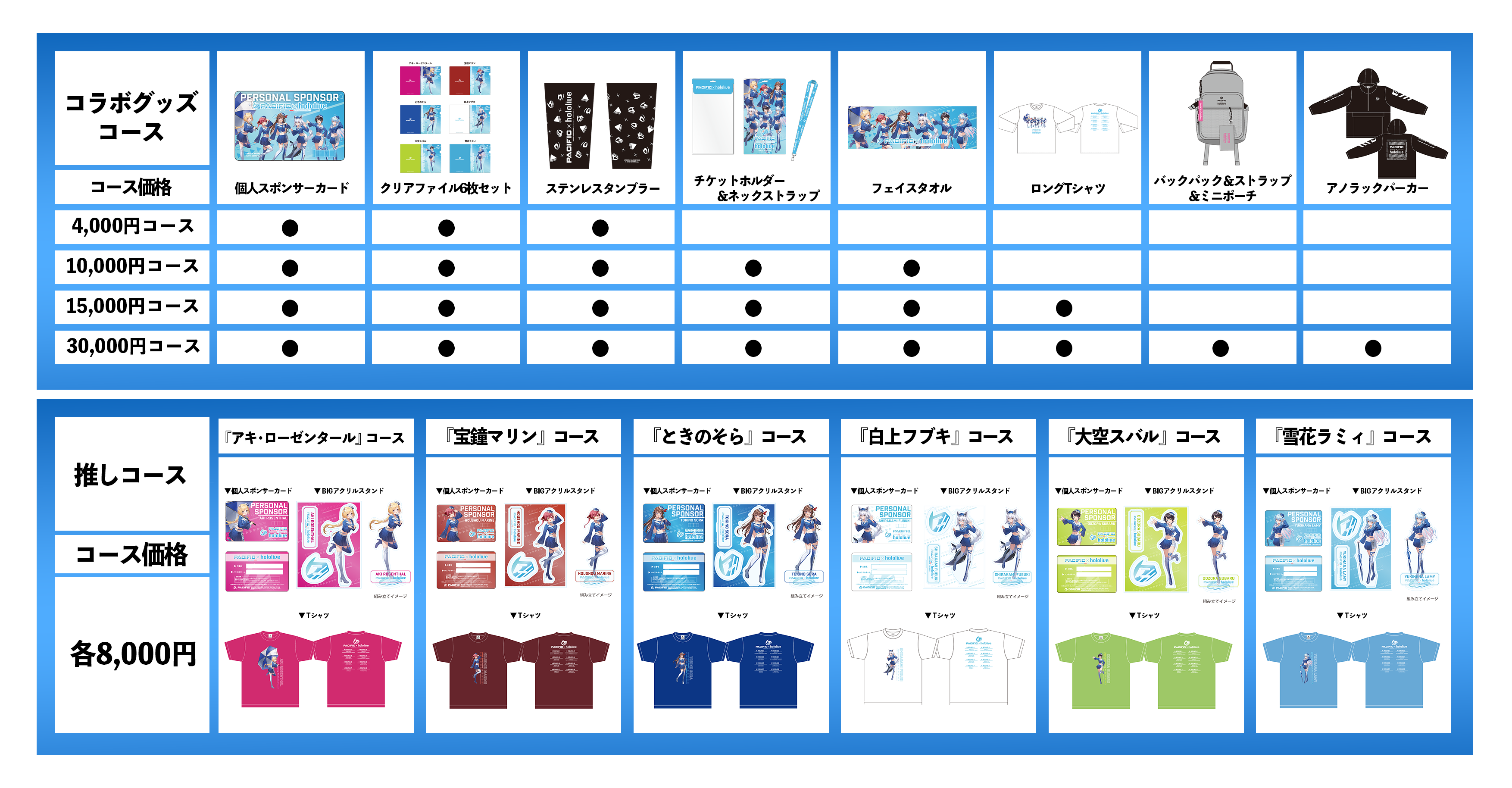 10,000円(税込)コース:4,000円(税込)コースの全特典と、チケットホルダー&ネックストラップ、フェイスタオル