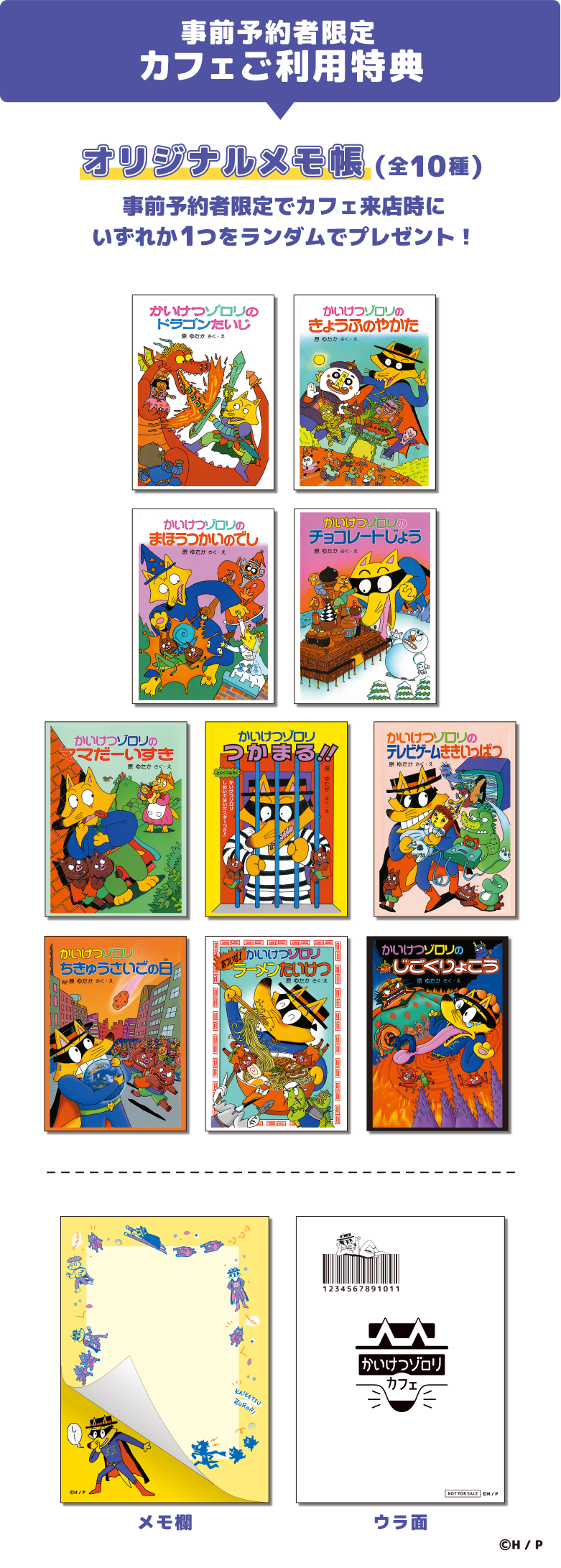 また、本の中に登場するアートを使用したカフェオリジナルグッズや、印象的な表紙を楽しめる特典なども設け、『かいけつゾロリ』35周年をさらに盛り上げます。