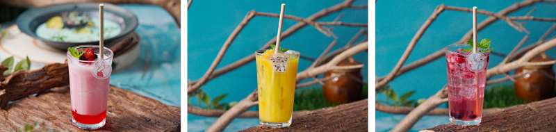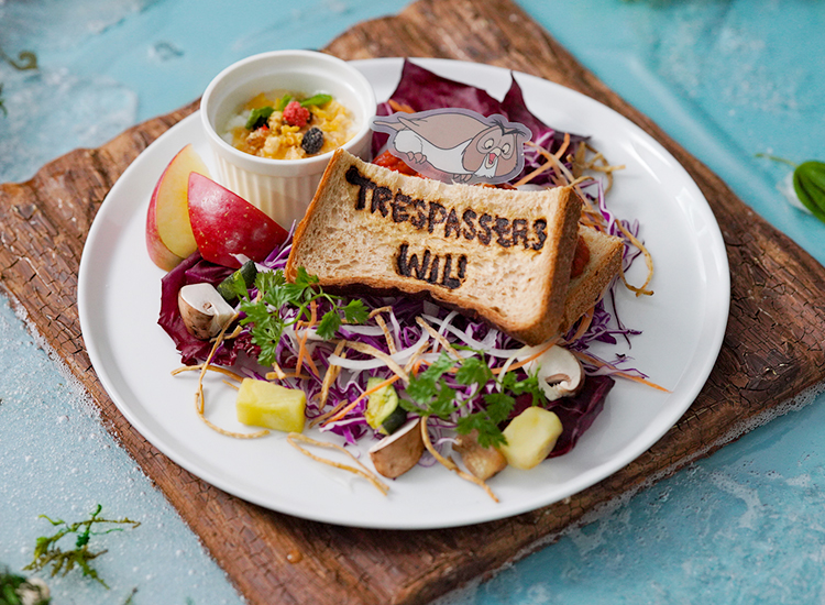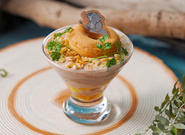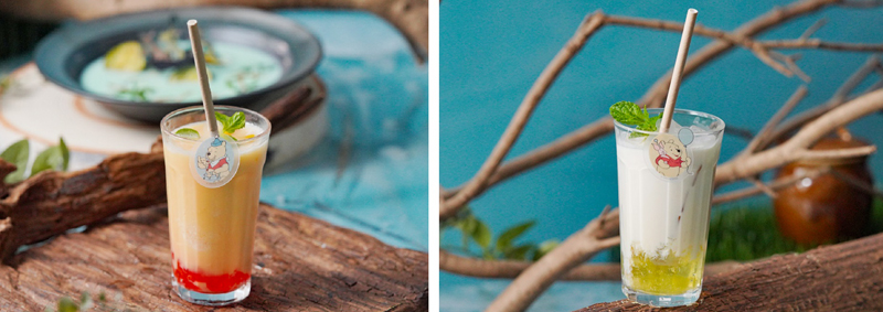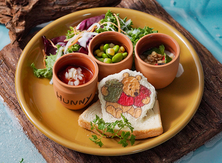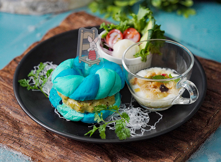 メニューは、水浸しの森で流されてしまった“ピグレット”をイメージしたベーグルサンド、“オウル”の看板風サンドウィッチ、傘のボートで“クリストファー・ロビン”の家へ向かった“カンガ”、“ルー”、“ラビット”、“ティガー”をイメージしたスープ、空いた穴から登場する“ゴーファー”をイメージしたものなど作品よりインスパイアされたテーマのユニークなフードメニューや個性豊かなキャラクターたちをモチーフにしたドリンクなどで、ディズニーの栄養成分に関するガイドラインに適合した塩分控えめで低糖質な、身体にやさしいヘルシーなメニューとなっています。