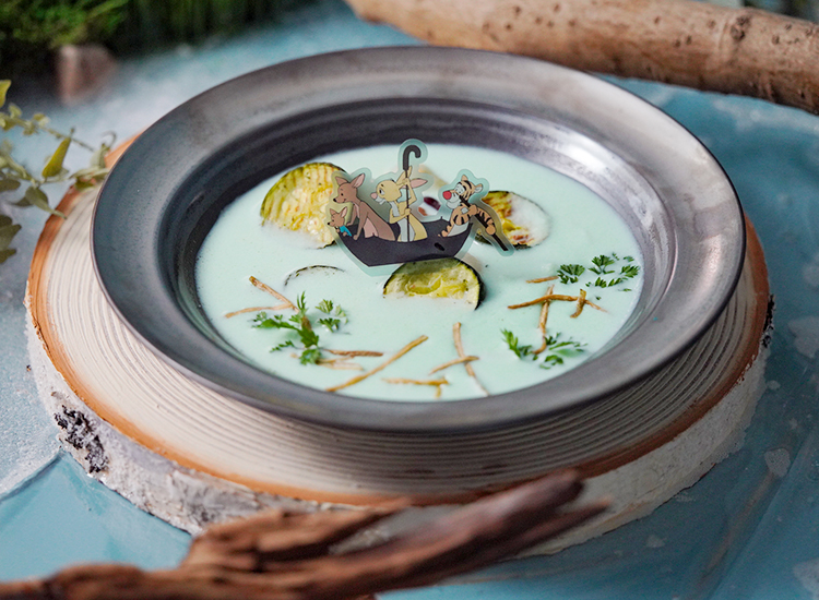 カンガとルー、ティガー、ラビットが、傘のボートでクリストファー・ロビンの家へ向かった様子を、水色のスープで再現。サイドディッシュにオススメです。