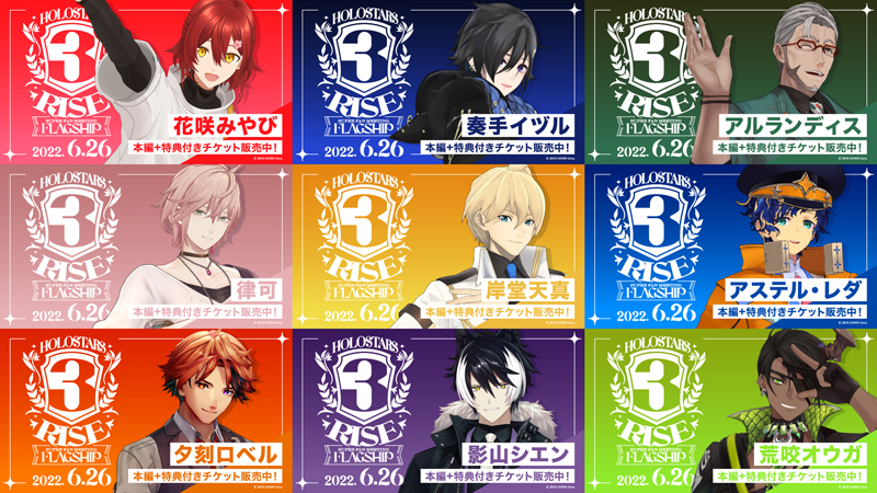 カバーが運営する男性VTuberグループ“ホロスターズ”メンバーの“花咲みやび”、“奏手イヅル”、“アルランディス”、“律可”、“アステル・レダ”、“岸堂天真”、“夕刻ロベル”、“影山シエン”、“荒咬オウガ”が出演するホロスターズ3周年記念イベント“HOLOSTARS 3RISE SUPER FAN MEETING ~FLAGSHIP~”を、2022年6月26日harevutaiにて開催する事をお知らせいたします。
