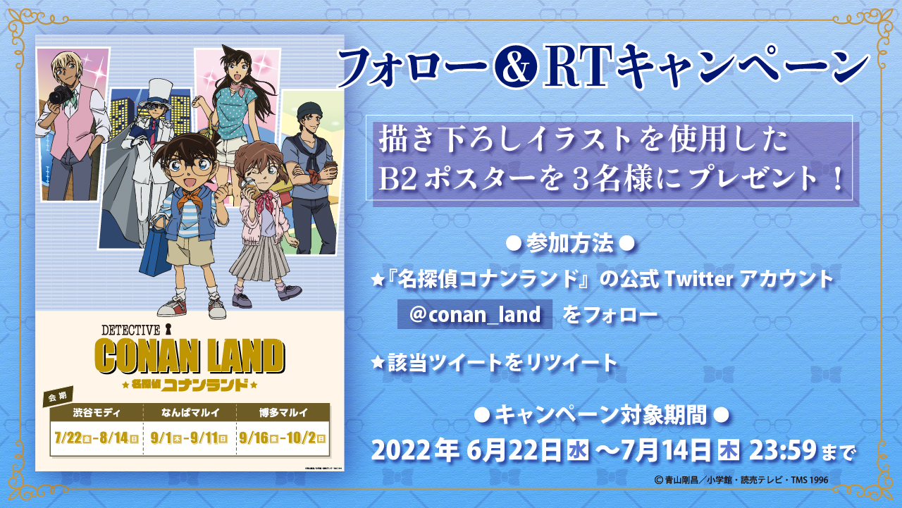 さらに、公式Twitterアカウントでは、同日よりフォロー&RTキャンペーンとして、描き下ろしイラストを使用したB2ポスターを3名様にプレゼントいたします。『名探偵コナンランド』の公式Twitterアカウントをフォローの上、該当ツイートをリツイートしてご応募ください。