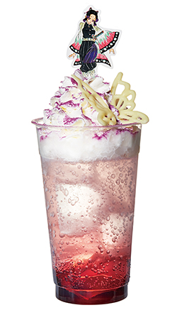 胡蝶しのぶをイメージした紫色のブルーベリーソーダ。トッピングにホイップクリーム、紫芋のパウダー、蝶の形のホワイトチョコを加えて、美しく仕上げます!