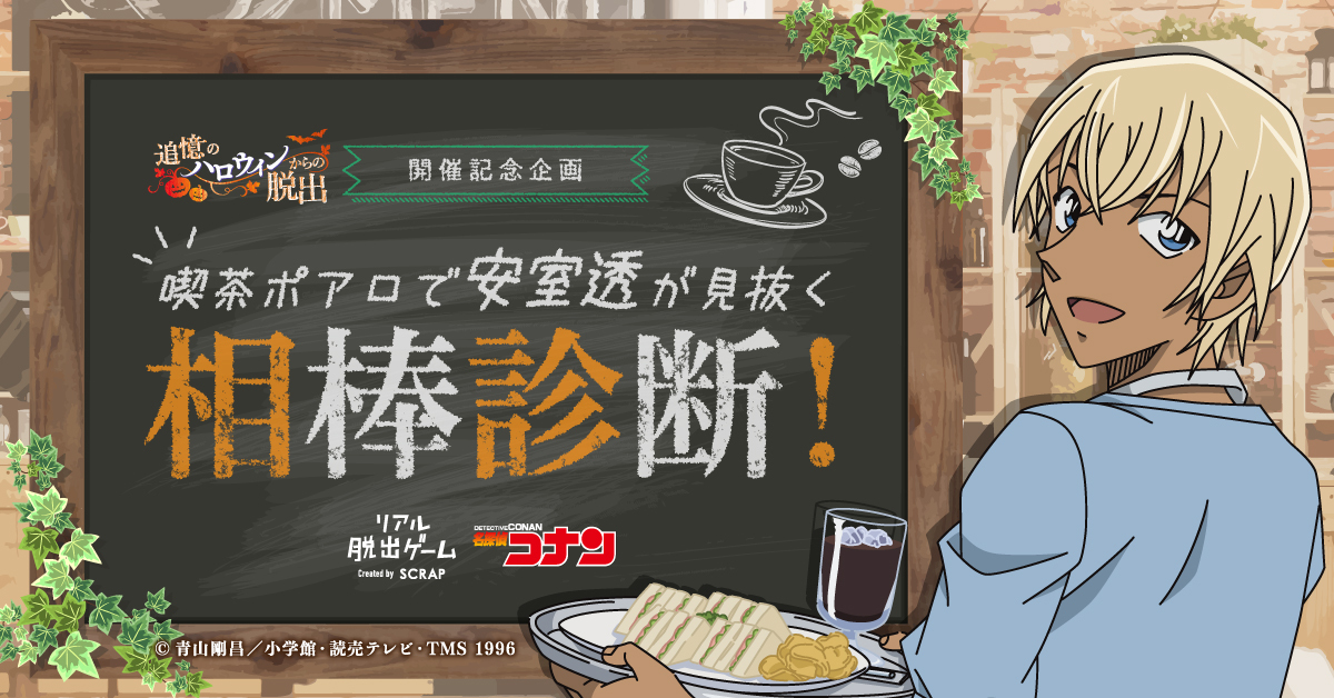SCRAPは、大人気TVアニメ『名探偵コナン』とコラボレーションしたリアル脱出ゲーム『追憶のハロウィンからの脱出』の開催を記念し、Webの無料診断コンテンツ“喫茶ポアロで安室透が見抜く相棒診断!”を公開しました。