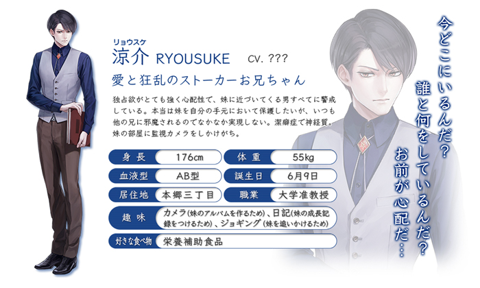 独占欲がとても強く心配性で、妹に近づいてくる男すべてを警戒している。本当は妹を自分の手元において保護したいが、いつもほかの兄に邪魔されるのでなかなか実現しない。潔癖症で神経質。妹の部屋に監視カメラをしかけがちだ。