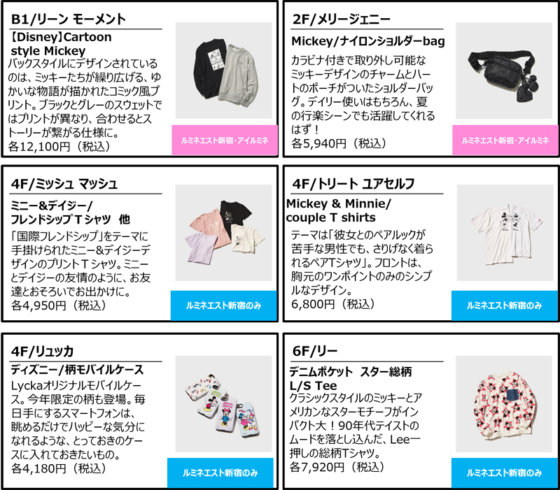 また、キャンペーン期間中は各ショップにてミッキー&フレンズのデザインをあしらった新デザインや限定のオリジナルグッズを販売します。また、オリジナルデザインの限定グッズを取り揃えたPOP UP SHOPも展開。一部ショップのグッズはルミネのネット通販“アイルミネ”でも販売します。