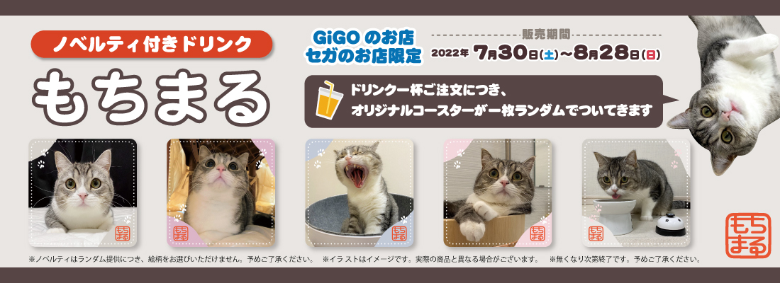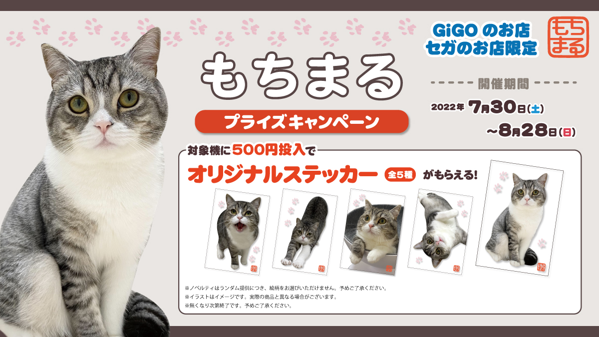 GENDA GiGO Entertainmentは、GiGOのお店、宝島のお店、セガのお店、GiGO ONLINE CRANEを含む店舗で2021年に“YouTubeで最も視聴された動物”としてギネス世界記録に認定されたスコティッシュフォールドの男の子“もちまる”とコラボレーションした“GiGO/宝島/セガのお店/GiGO ONLINE CRANE限定 もちまるキャンペーン”を2022年7月30日から開催いたします。