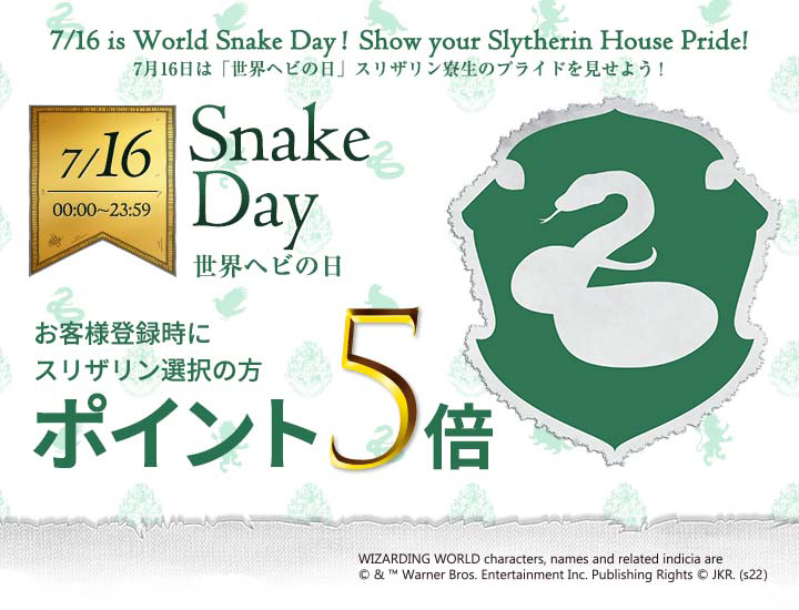 2022年7月16日の“世界ヘビの日”にちなみ、野心と誇り、狡猾さを合わせ持つ者が集うとされる“スリザリン”の寮に所属する、スリザリン寮生のお客さまは当日のお買い上げに限りポイントが5倍になります。グリフィンドール寮生、レイブンクロー寮生、ハッフルパフ寮生のお客さまは次の機会を楽しみにお待ちください。