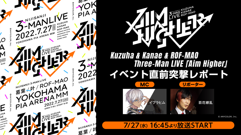 ANYCOLORが運営するVTuber/バーチャルライバーグループ“にじさんじ”は、7月27日に開催が迫る“Kuzuha&Kanae&ROF-MAO Three-Man LIVE Aim Higher”に出演する、6名からのメッセージ動画を公開しました。また、現在販売中の同イベントのネット配信視聴チケットに関する情報を含む、イベント詳細についてもお知らせいたします。