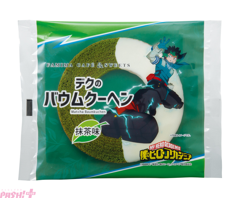 主人公デクのイメージカラーに合わせた抹茶味のバウムクーヘンです。ホワイトチョコを半掛けしました。