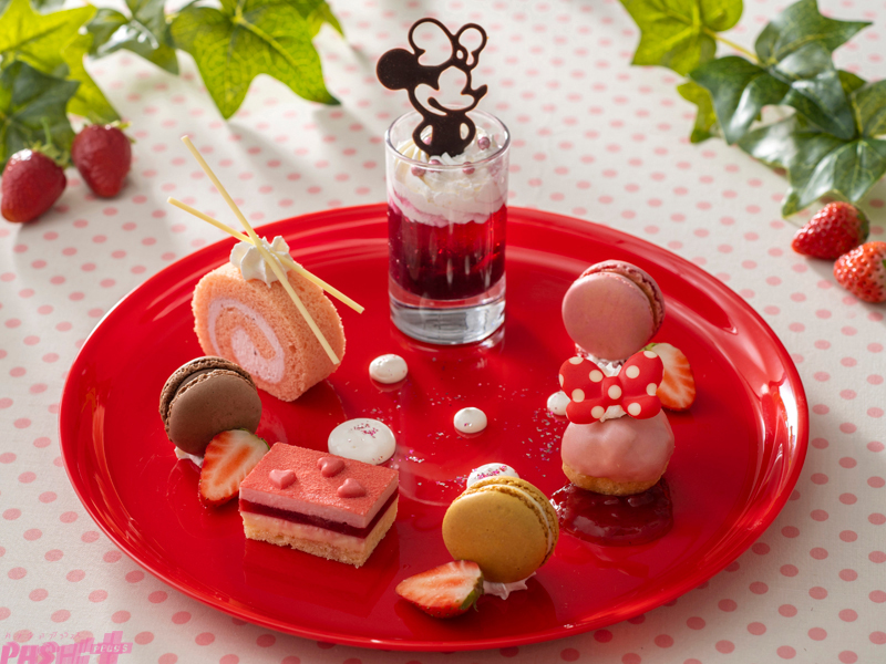 東京ディズニーランドの“センターストリート・コーヒーハウス”では、ミニーのラブリーデザートプレートを販売します。ミニーマウスのシルエットをしたチョコレートが乗ったミックスベリーとハイビスカスフレーバーゼリーのグラスデザートや、ドット柄のリボンがモチーフのチョコが乗った苺のプチシュークリームなどを盛り合わせたキュートさがあふれるプレートです。