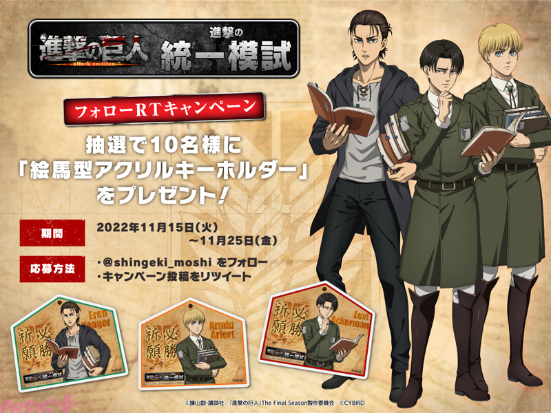 サイバードは、『進撃の巨人』の公式テスト“進撃の統一模試”を、2022年11月17日~2023年1月20日の期間で実施します。また、“進撃の統一模試”公式Twitterで“絵馬型アクリルキーホルダー”が当たるフォロー&リツイートキャンペーンを開催中です。
