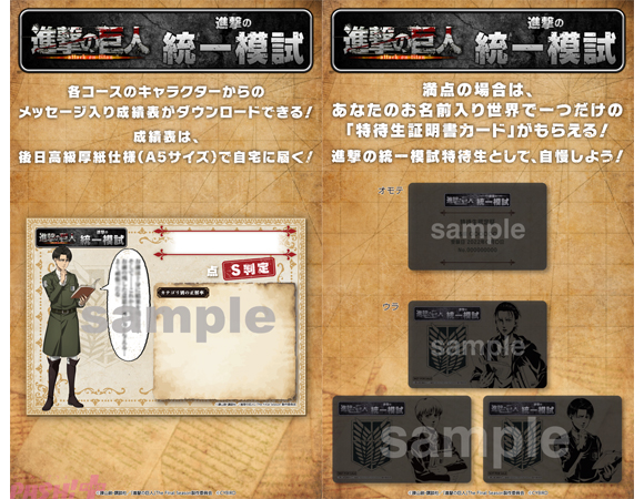 受験完了後はエレン・アルミン・リヴァイの各コースのキャラクターからのメッセージ入りデジタル成績表をダウンロードできます。また、受験者全員に高級厚紙仕様のリアル成績表を後日お届けします。さらに、満点を獲得した方全員に特待生証明書カードをプレゼントします。カードには受験者の名前が入り、世界で1つだけのカードとなります。