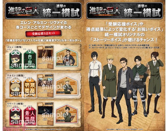 受験者はエレン・アルミン・リヴァイの3コースから1つを選ぶことができます。出題範囲は全コース同一ですが、グッズ特典のデザインがコースによって異なります。