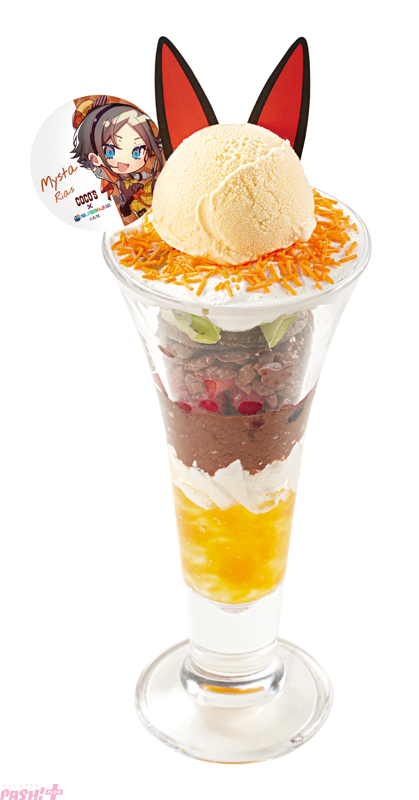 トップにミスタを型どった、キャラカラーのオレンジ色が目を惹くかわいらしいパフェです。パフェの中層はミスタが好きなチョコアイスやチョコプリンに、キャラカラーをイメージした爽やかな味わいのオレンジソースを合わせており、コクがありながらもさっぱりとした味わいをお楽しみいただけます。ミスタが好きなフレッシュキウイも入れました。パリパリ食感のシュガースプレーやサクサクのチョコクリスピーで食感もお楽しみください。