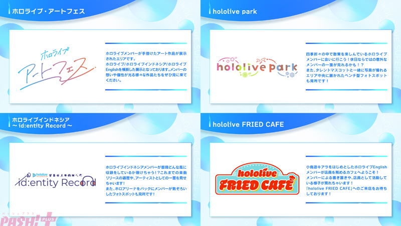 さらにEXPOの会場イメージや、ブース情報も解禁。ホロライブメンバーの人気配信企画を元にした“ホロライブ幼稚園”、“ホロライブ運動会”、“ホロライブ警察”、“ホロライブ・ホスト”が体験ブースとして登場。また、ホロライブインドネシアやホロライブEnglishのオリジナルブースも登場する盛りだくさんな内容となっております。“ホロライブプロダクション”一色の2日間をぜひお楽しみください。