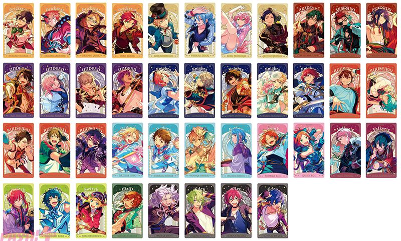 種類:49種(天祥院英智/日々樹渉/姫宮桃李/伏見弓弦/氷鷹北斗/明星スバル/遊木真/衣更真緒/守沢千秋/深海奏汰/南雲鉄虎/高峯翠/仙石忍/天城一彩/白鳥藍良/礼瀬マヨイ/風早巽/乱凪砂/巴日和/七種茨/漣ジュン/斎宮宗/影片みか/葵ひなた/葵ゆうた/天城燐音/HiMERU/桜河こはく/椎名ニキ/朔間零/羽風薫/大神晃牙/乙狩アドニス/真白友也/仁兎なずな/天満光/紫之創/蓮巳敬人/鬼龍紅郎/神崎颯馬/朱桜司/月永レオ/瀬名泉/朔間凛月/鳴上嵐/逆先夏目/青葉つむぎ/春川宙/三毛縞斑)