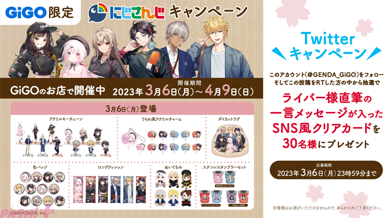 大人気バーチャルライバーグループ“にじさんじ”とコラボレーションした本キャンペーンでは、対象のクレーンゲームへ500円投入することで、“SNS風クリアカード(全12種)”を1枚ランダムでもらえます。また、“春のおでかけ”をテーマにしたGiGO限定のアイテムが多数登場します。