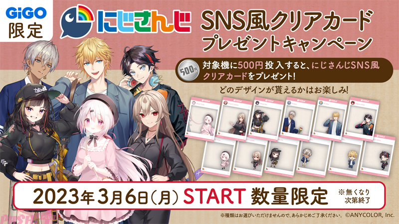 GENDA GiGO Entertainmentは、“にじさんじ SNS風クリアカードプレゼントキャンペーン2023”を2023年3月6日よりGiGOグループのお店にて開催します。