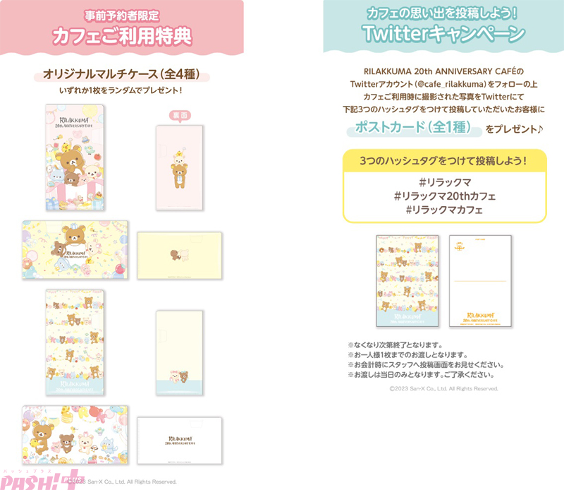 その他、カフェオリジナルグッズや特典、Twitterキャンペーンなども設け“リラックマ20周年”を盛り上げます。“リラックマ”の20周年をお祝いした、たくさんの“ありがとう“をつめこんだテーマカフェで、思い出を語り合いながら、趣向を凝らしたオリジナルメニューやグッズをお楽しみください。