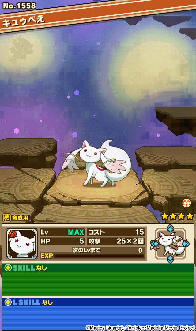 さらに、お馴染みの「キュゥべえ」が大量に出現するダンジョン「魔法の使者」も期間限定で登場します。クリアすると手に入るコラボキャラクター「キュゥべえ」は、育成素材として使用すると、副属性を上書きせずに多くの経験値を獲得することができる育成用キャラクターです。