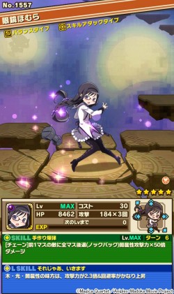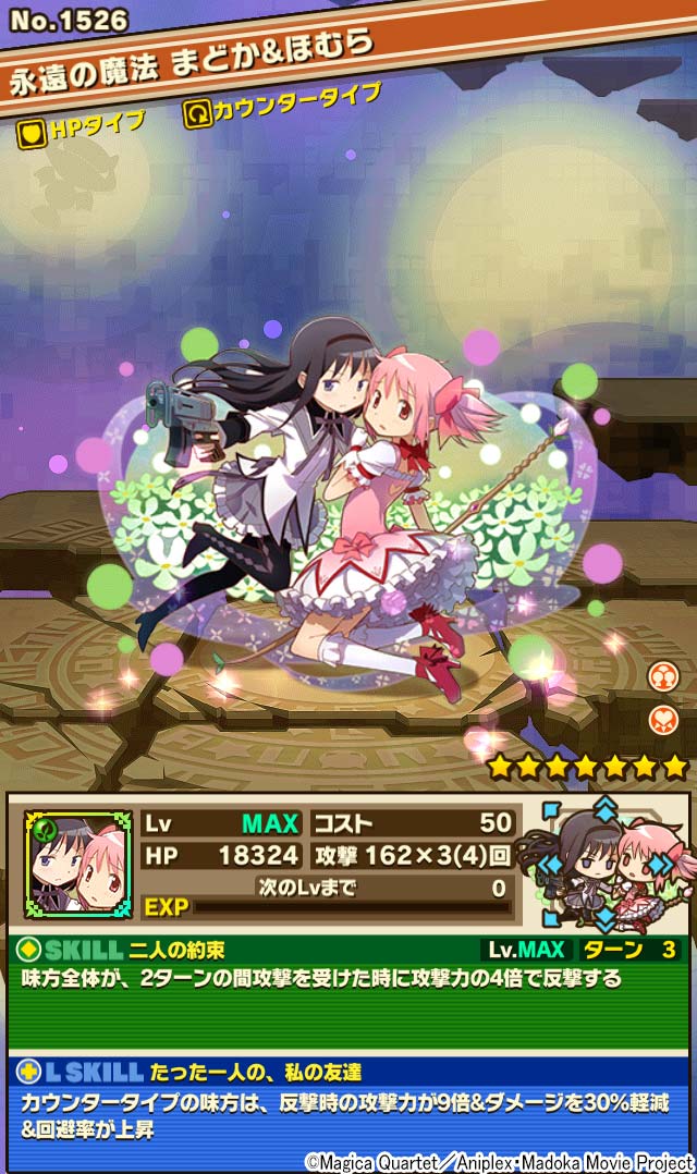 さらに、「鹿目まどか」と「暁美ほむら」がペアになった「永遠の魔法 まどか&ほむら」や、強大なダメージスキル「ティロ・フィナーレ」を持つ「巴マミ」などのその他のキャラクターたちも、それぞれアニメをイメージしたスキルやリーダースキルを持っており、たいへん強力で使いやすいキャラクターとなっています。