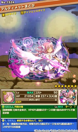 「アルティメットまどか」は、ダメージ軽減とHPが毎ターン回復するリーダースキルに加え、隙の少ないターン数で使える、強力な”復活”スキルを持っています。「絶望する必要なんて、ない」というセリフにふさわしく、抜群の安定度を誇るキャラクターです。