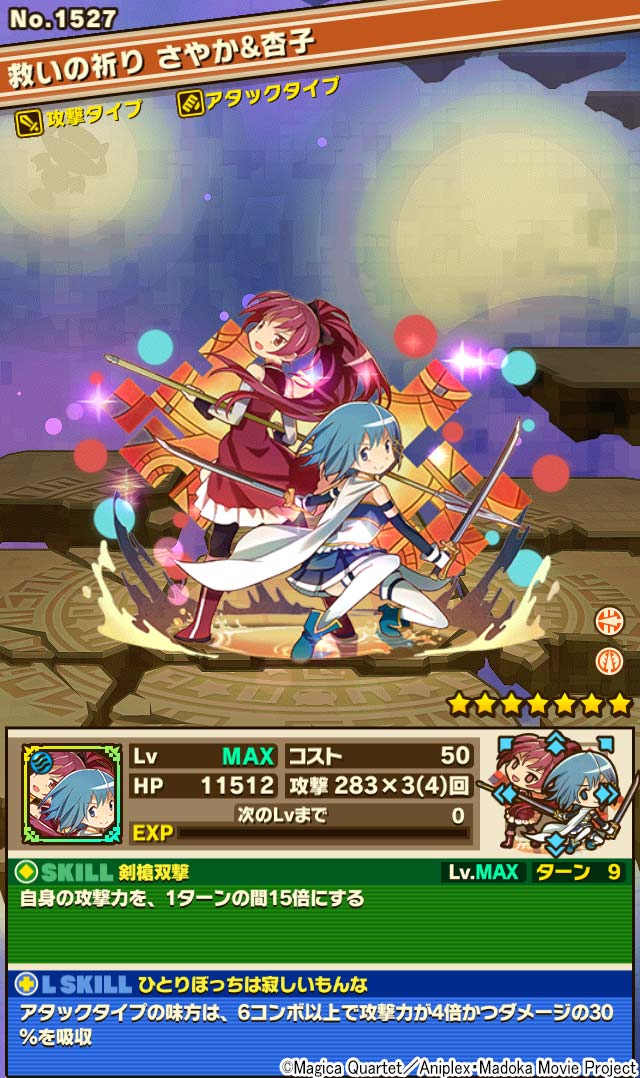「美樹さやか」「佐倉杏子」とは別でラインナップされている、二人がペアになった「救いの祈り さやか&杏子」はコンボ数に応じて、攻撃力を大幅に上げつつHPを回復する強力なリーダースキルを持っています。
