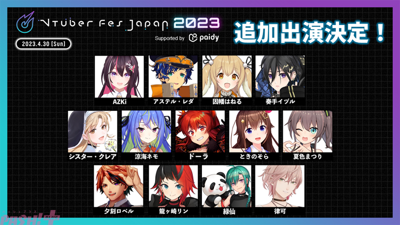 3年4月30日に開催される、日本最大級のバーチャルアーティストたちの音楽&トークライブフェス“VTuber Fes Japan 2023 Supported by Paidy”出演アーティストの追加情報を公開しました。