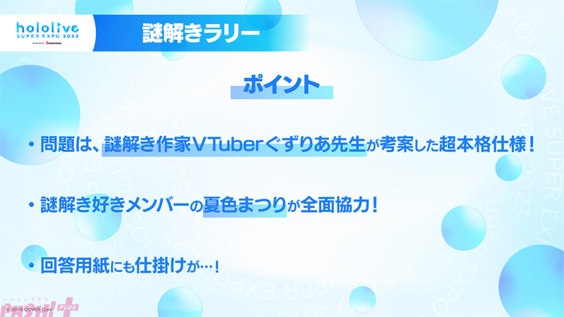 カバーは、“ホロライブプロダクション”において2023年3月18日、19日に開催する2回目の事務所全体イベント《hololive SUPER EXPO 2023 Supported By Bushiroad》について、『ホロライブ・オルタナティブ』ブースがメタバースプロジェクト『ホロアース』に登場、また会場エリアマップや謎解きラリーの新情報が解禁したことをお知らせいたします。