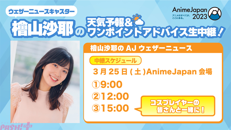 気象情報番組『ウェザーニュースLiVE』のキャスター・檜山沙耶さんが、3月25日にイベント当日の会場の熱気を生中継。アニメ好きの檜山さんならではの天気予報やワンポイントアドバイス、会場リポートをお楽しみに。コスプレでの出演があるかも!? 詳細はAnimeJapan公式サイトをチェック!