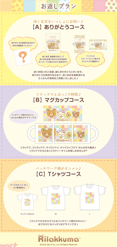 本クラウドファンディングにご参加いただいた方にはお返しとして、ここでしか手に入らない特別グッズや、リラックマたちとあなただけの特別なひとときを楽しめるオンライングリーティング、さらにリラックマ・コリラックマによる“成くま式ツアー“の案内を用意しています。今回限定のスペシャルなクラウドファンディングにぜひご参加ください!