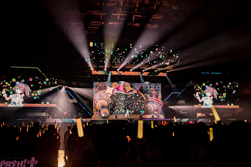 1曲目はDAY2全員による「Shiny Smily Story」。アイドル衣装に身を包んだホロライブタレントが上下2段に分かれたステージに並び、2番になるとメンバーチェンジ。ホロライブ最初の公式曲という選曲も相まって、最初からクライマックスのような展開に会場の一体感もすさまじく、ペンライトとコールを浴びながら歌うホロメンはより一層輝いて見えた。