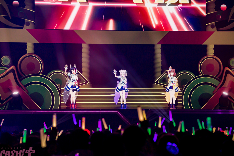 ユニットパートのトリを飾るのはStartend。2022年のVTuber最協決定戦で星街すいせい、湊あくあ、常闇トワにより結成されたチームで、今でも根強い人気を誇る。そんな3人は、3月17日に歌ってみたをアップしたばかりの「空奏列車」を披露。すいせいのロングトーンに感情をゆさぶられたかと思えば、最後には3人が頭上にこぶしを掲げる姿も印象に残った。