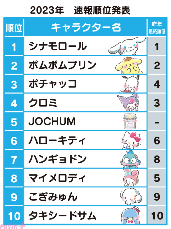 また、人気グローバルボーイズグループJO1とサンリオがタッグを組んで開発した、今年初エントリーの“JOCHUM”が、“ハローキティ”(昨年6位)や“マイメロディ”(昨年5位)などの上位常連キャラクターを抑えて5位にランクイン。昨年34年ぶりにTOP10入りした“ハンギョドン”(昨年8位)も7位と、好調な滑り出しを見せました。9位の“こぎみゅん”(昨年9位)、10位の“タキシードサム”(昨年10位)の動向にも注目です。