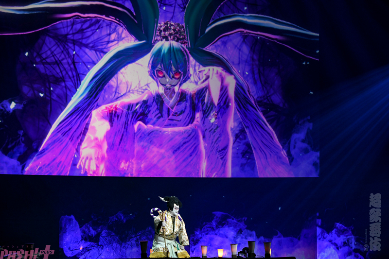 より豪華になった舞台演出の中で、中村獅童さん、澤村國矢さんによる、源頼光と袴垂保輔の2役早替りと演じ分け、美しさが増した初音ミクが演じる悪役、七綾太夫と源頼光の愛憎なかばの最終決戦、など見どころ満載です。