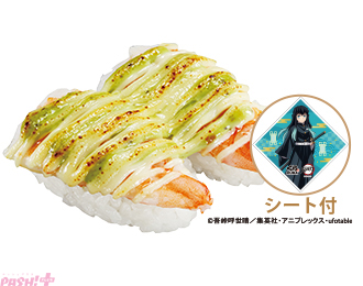 “甘露寺蜜璃”のチャームポイントの一つである髪色を、旨味たっぷりのカニ身と、色鮮やかなアボカドで再現。ぷりぷりのエビとも相性抜群です。