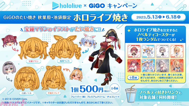 GiGOのたい焼きにて、宝鍾マリン描き下ろしイラストを使用した“ホロライブ焼き”が販売。1個購入でオリジナルコースター(全8種/ランダム)が1つもらえます。