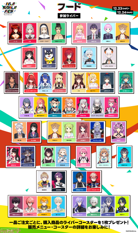 展示ライバー:月ノ美兎/樋口楓/剣持刀也/伏見ガク/叶/卯月コウ/社築/緑仙/笹木咲/椎名唯華/魔界ノりりむ/ ジョー・力一 /夢追翔/戌亥とこ/リゼ・ヘルエスタ/三枝明那/加賀美ハヤト/葉加瀬冬雪/夜見れな/相羽ういは/シェリン・バーガンディ/星川サラ/白雪巴/不破湊/フレン・E・ルスタリオ/長尾景/レイン・パターソン/レオス・ヴィンセント/壱百満天原サロメ/渡会雲雀