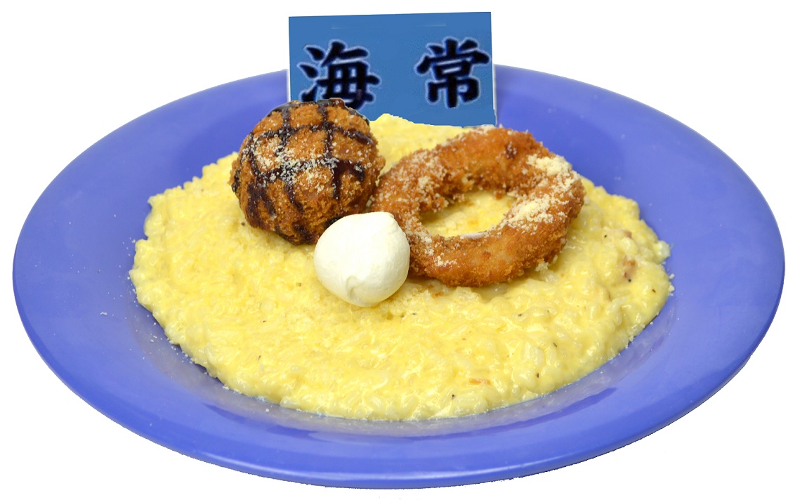 海常高校をイメージしたカルボナーラリゾットです。バスケットボール をイメージしたミニキャベツコロッケ、イカリングフライ、モッツァレ ラチーズをトッピングしました。